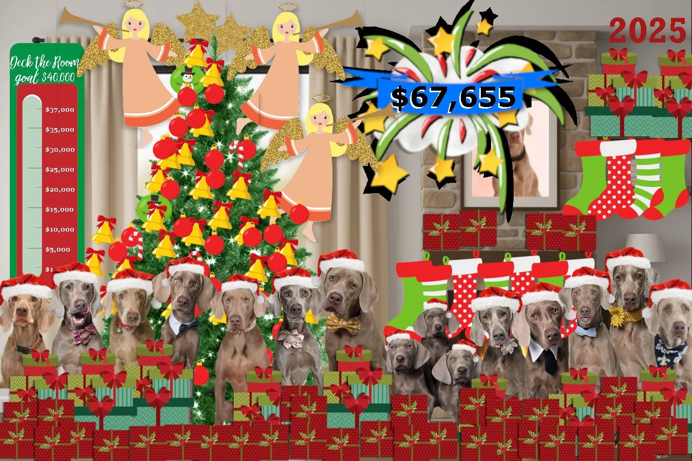 2025 has been an incredibly challenging year; intakes are up, adoptions have been a struggle, and medical expenses have soared. Our volunteers have worked so hard to save as many Weimaraners in need, including helping other rescue organizations throughout the southern United States who were overwhelmed. We’ve seen a spike in heartworm positive dogs; they all receive the best veterinary care before they are medically cleared for adoption. We continue to provide as many of our rescues as possible with prophylactic gastropexies, something that we are incredibly proud of as an organization. The success of our final fundraiser of the year, our Christmas Tree Room, will ensure that we will continue to rescue, rehabilitate, and rehome Weimaraners in need in 2026. With your donations, we’d love to fill our room with virtual gifts, presents, stockings, ornaments, Weimaraners, and other decorations. Happy Holidays!